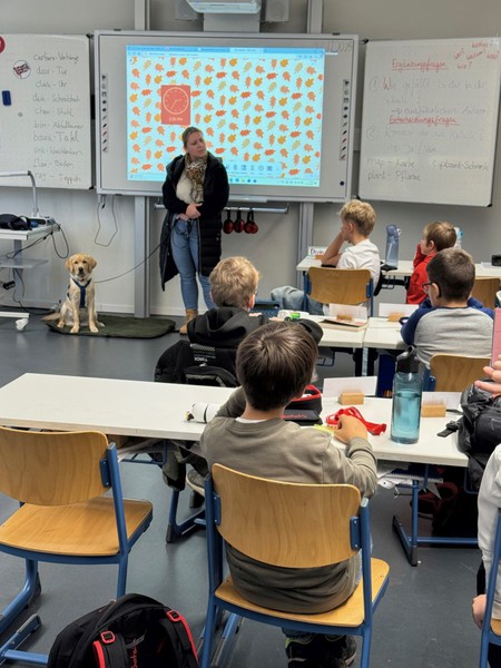 Gemeinsam mit seiner Begleiterin Frau Schwarzkopf zeigte Bailey, wie ein Schulhund arbeitet, worauf man im Umgang mit Hunden achten sollte und welche Signale Hunde geben, wenn sie sich wohlfühlen – oder auch, wenn sie Ruhe brauchen. Die Kinder hörten aufmerksam zu und stellten viele interessierte Fragen.