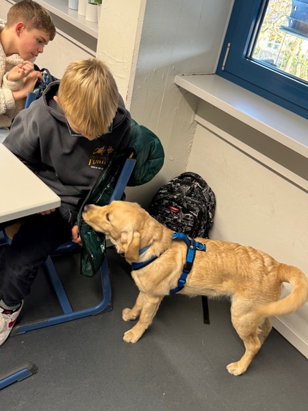 Im Anschluss durfte Bailey sein Können demonstrieren und natürlich gab es auch einige vorsichtige, aber begeisterte Streicheleinheiten. Der Besuch war nicht nur spannend, sondern bot auch eine wertvolle Gelegenheit, soziale Kompetenzen zu stärken und den respektvollen Umgang mit Tieren zu erleben.