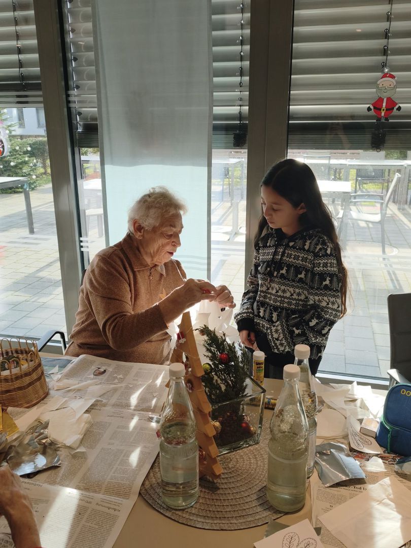 Anschließend wurde zusammen gebastelt: Aus Prägefolie entstand schöner Tannenschmuck, bei dem Kinder und Bewohner*innen sich gegenseitig halfen. Besonders schön war das Miteinander – es wurde unterstützt, gelacht und am Ende auch selbst Gebasteltes verschenkt.